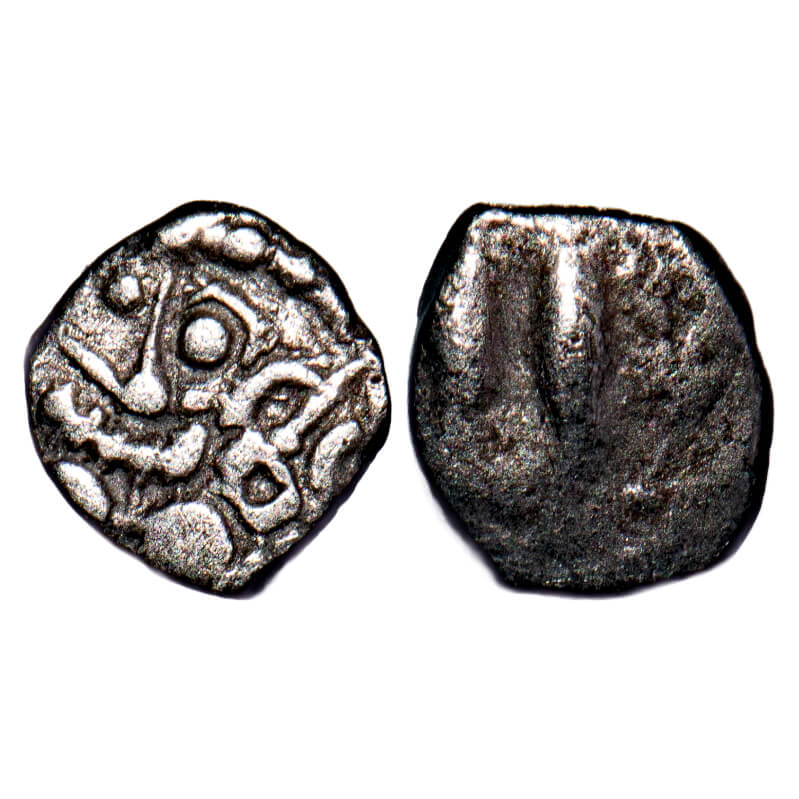 Kadambas of Hangal (9-10 AD), Silver Tara Fanam, 0.14gm, 7.35x5.05mm, Obv: Shardula (mythical lion) standing facing left, Rev: two fish. Unlisted in Ganesh. Very Fine, Scarce.