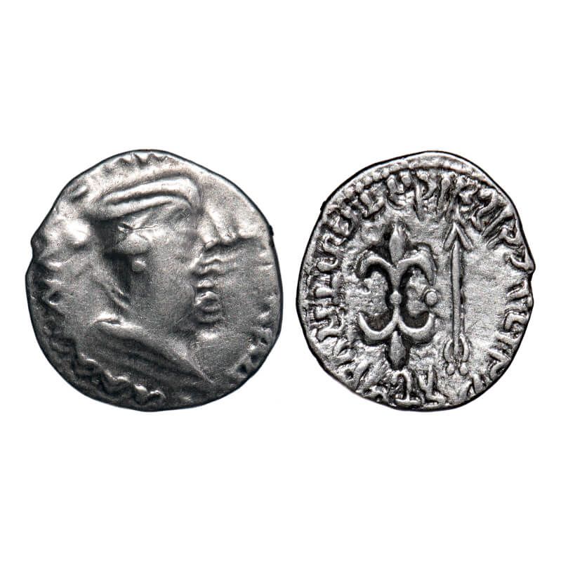 | Western Kshatrpas, Nahapana (c. 119-124 AD), Silver Drachms, 2.04gm, 16.04x15.65mm, Error, Obv: Bust of Nahapana facing to right double struck, around corrupt Greek inscriptions, Rev: Arrow and thunderbolt with Kharoshti legend and Brahmi ‘Rajno ksaharata nahapanasa ‘legend. Pieper # 3352. Very Fine, Scarce. |
