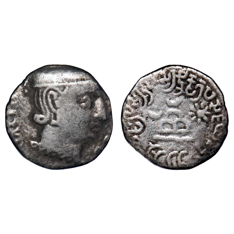 | Western Kshtrapas, Early Kardamaka ruler - Rudradaman, son of Jayadaman as 'Mahakshtrapa' (c. 165 - 177 AD) Silver Drachma, 2.15gm, 14.67x15.06mm, Obv: Bust of king facing right, pseudo Greek legend around, Rev: Three arch hill with crescent flanked with sun and crescent, Brahmi legend 'RAJNO KSHTRAPASA JAYADAMA PUTRASA RAJNO MAHAKSHTRAPASA RUDRADAMASA' around. Fishman 7.3a. Very Fine. Very Scarce. |