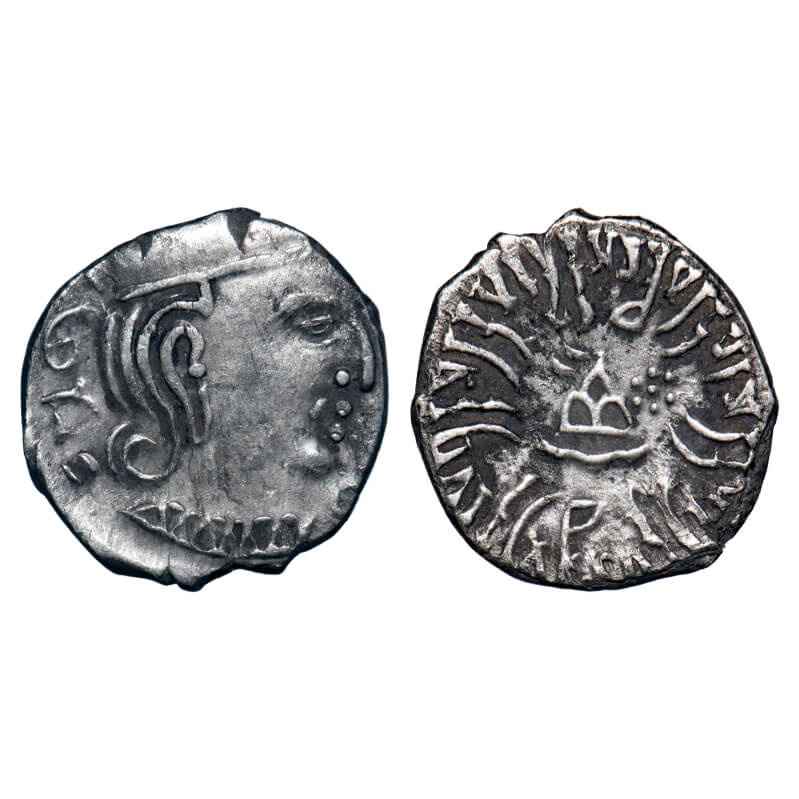 | Western Kshatrapa, Svami Rudrasena III (c. 348-378 AD) son of Svami Rudradaman II, Silver Drachma, 2.01gm, 14.50x14.62mm, SE 280, Obv: Bust of the king facing to right behind date digit in Brahmi, Rev: Three arched hill with sun and moon, around Brahmi legend ‘Rajna Mahakshatrapasa Svami Rudradamaputrasa Rajna Mahakshatrapasa Svami Rudrasenasa’. Pieper # 3416. Very Fine, Scarce. |