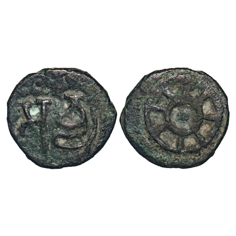 Panchalas of Ahichhatra Dynasty, King Achyuta (4th Cen. AD), Copper Unit, 1.42gm 12.49x13.56mm, Obv: Brahmi legend achyu, Rev: 8 spoked wheel. Pieper # 1377. Very Fine, Scarce.