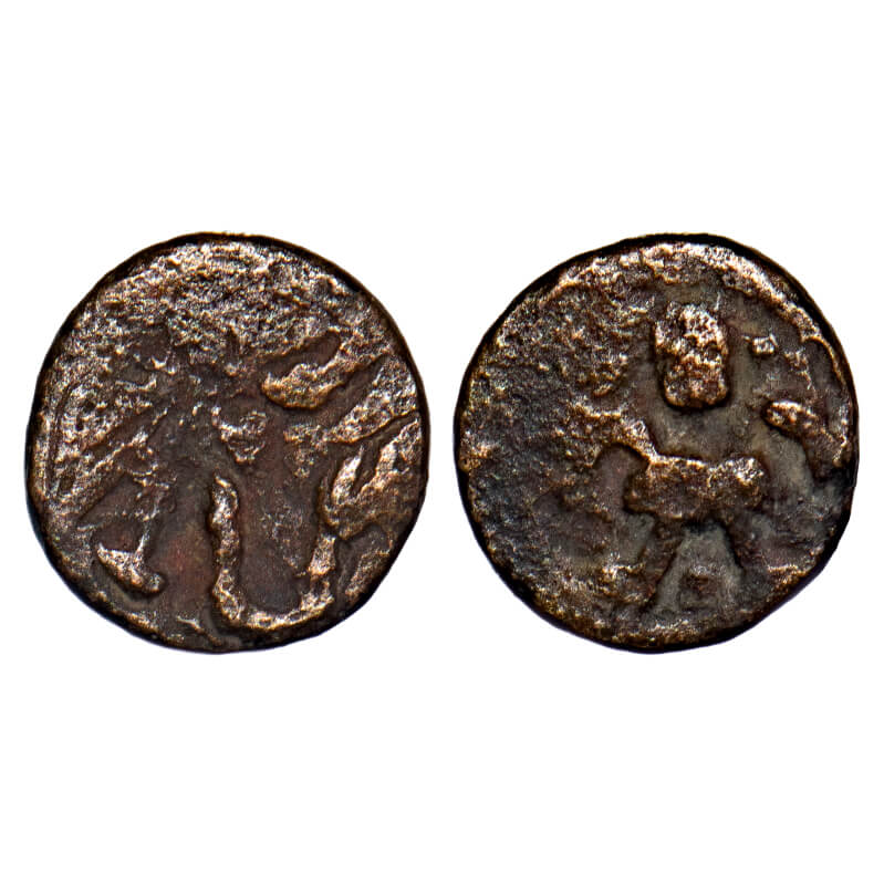 | Guptas, Kumaragupta (c. 415 - 450 AD), Madhyadesha type (MP), Copper Unit, 0.33gm, 7.56x8.03mm, Obv: Stylized Garuda emblem, Rev: Partial Brahmi legend 'GUPTA'. Fine. Very Rare. (Copper coins of Gupta dynasty are considered to be very rare, especially issues of Kumara Gupta.) |