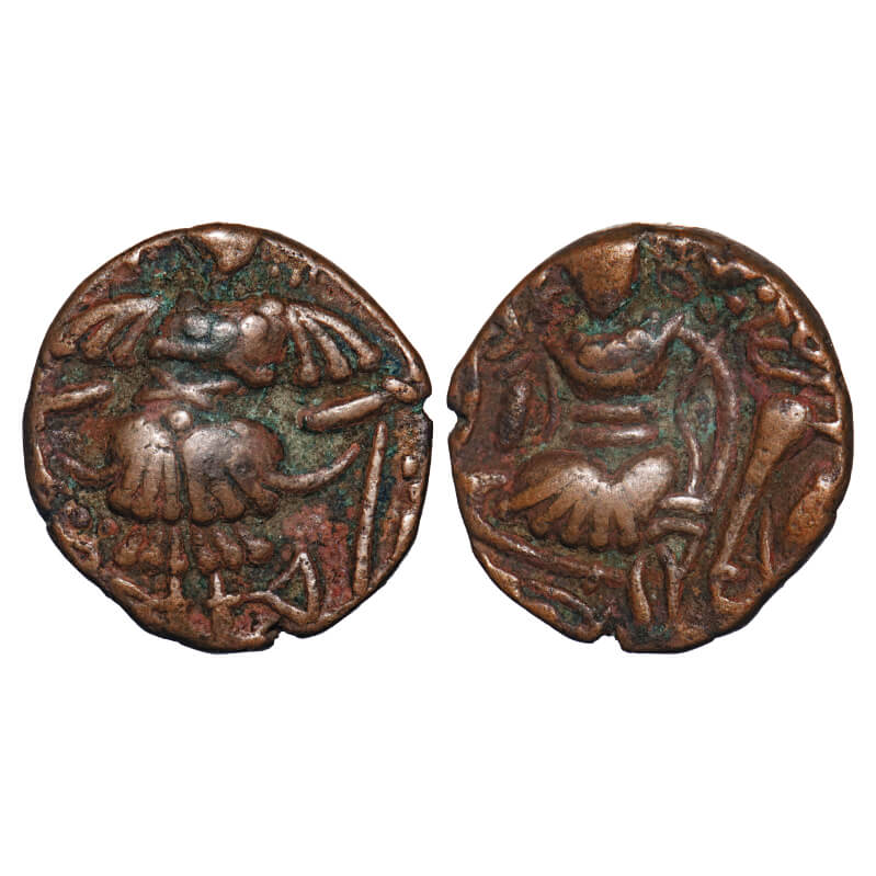| Huns, Kashmir, Toramana II, Copper Drachma, 6.77g, 21.17x20.35mm, Obv: King standing slightly left, sacrificing over altar and holding trident with Brahmi legend ' Sri Toramana to left, Rev: Ardoksho seated on lion facing, holding diadem and cornucopia, letter ‘Jaya’, on right Large flan. Very Fine, Scarce. |