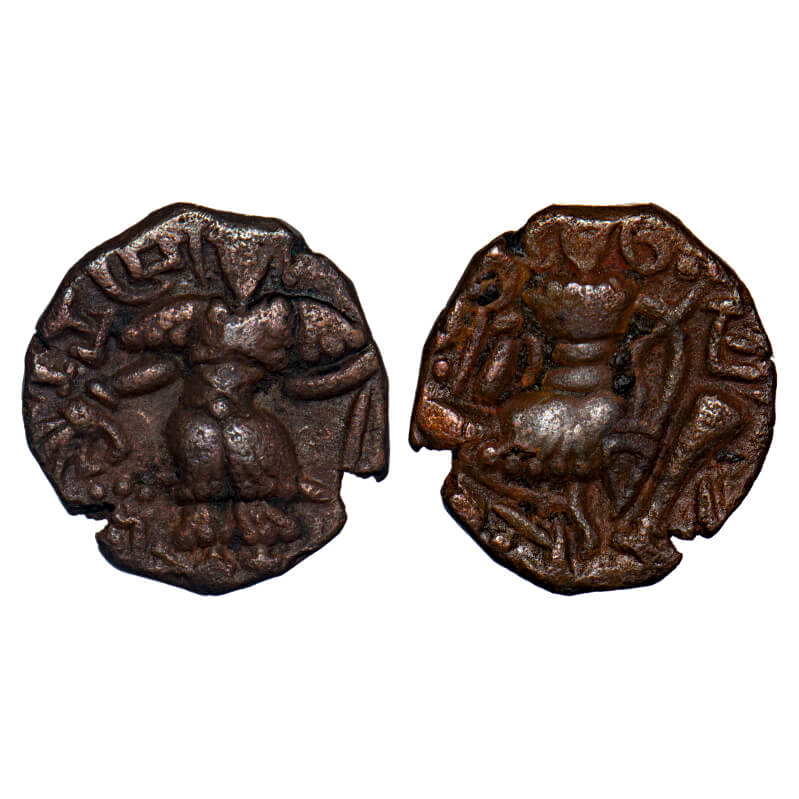 | Huns, Kashmir, Toramana II (c. 540-570AD), Copper Drachma, 6.70gm, 21.19x20.15mm, Obv: King standing slightly left, sacrificing over altar and holding trident with ’Sri Toram(na)’ in Brahmi to left, Rev: Ardoksho seated facing, holding diadem and cornucopia with letter ‘Jaya’. Mitch # ACW 3792. Very Fine, Scarce. |