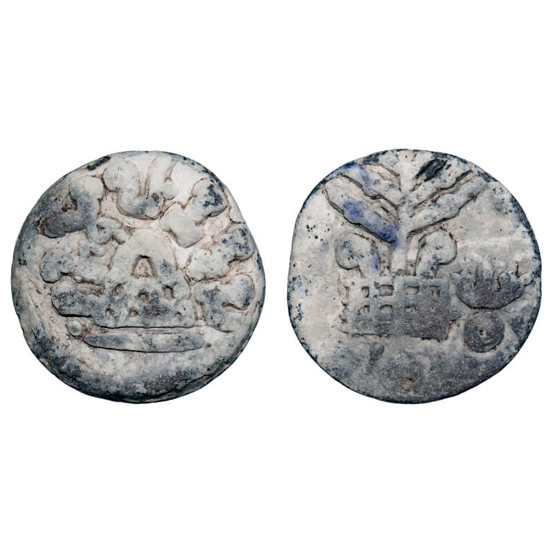 | Anandas of Karwar, Mulananda, Lead Unit, 14.06g, 27.18x26.85mm, Obv: Eight arched hill in centre around bold Brahmi legend ‘Rajno Mulanandasa’, Rev: Tree in railing within eight compartments, both sides symbol. Mitch K&A 42. About Very Fine, Scarce. |