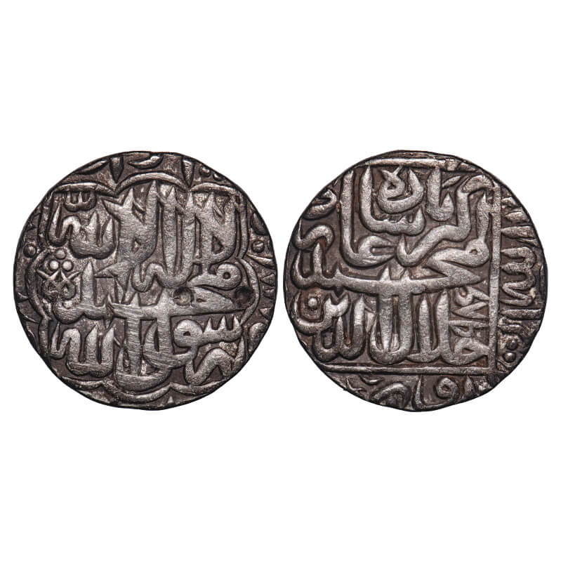 | Akbar (AH 963-1014/1556-1605 AD), Silver Rupee, 11.18g, Lahore Mint, Beautiful mint mark, AH 986, Kalima within well centred scalloped square & rev legends in square, deep strike, Toned, Very Fine+, Very Scarce. |
