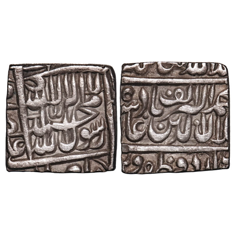 | Akbar (AH 963-1014/1556-1605 AD), Silver Square Rupee, 11.28g, Urdu Zafar Qarin (Army camp associated with victory) , AH Alif (1000) Obv: The Kalima Shahada around the four Caliphs' names, Rev: "Jalal ud-din Muhammad Akbar Badshah Ghazi" Alif year in centre, Urdu Zafar Qarin at the bottom, superb bold strikes. Extremely Fine, Very Scarce. |