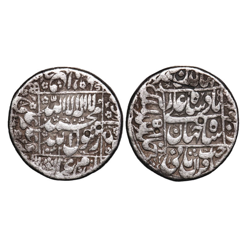 | Shah Jahan I, Silver Rupee, 11.36g, Burhanpur Mint, AH 1042/5 RY, square area type, with Khallada Allah Mulkahu on left margin and mint on right margin of reverse, a complete center struck coin. KM 235.33. Very Fine, Rare. |