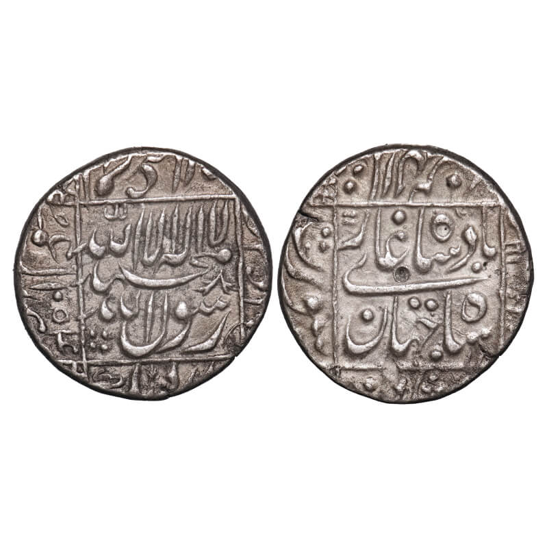 | Shah Jahan I, (AH 1037-1068 /1628-1658 AD) Silver Rupee, 11.39g, Surat Mint completely visible , AH 1054/18 RY, legends in square area, Sharp strike, Toned, About Extremely Fine, Scarce. |