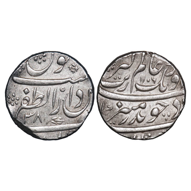 Aurangzeb, Silver Rupee, 11.37g, Dar ul Zafar Bijapur Mint, AH 1106/38 RY, with flower symbol on reverse. KM 300.23. About Extremely Fine, Scarce.