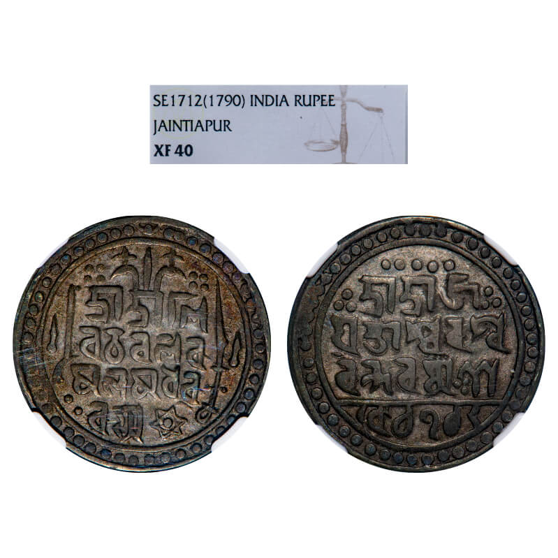Jaintiapur, Silver Rupee, Ramsimha II, SE 1712, Obv: Sri Sri Si/va Charana ka/mala Madhu Ka/rasya, Rev: Sri Sri Ja/yantipura Pu/randarasya Sa/ke 1712, KM 206. NGC graded XF 40, Rare.