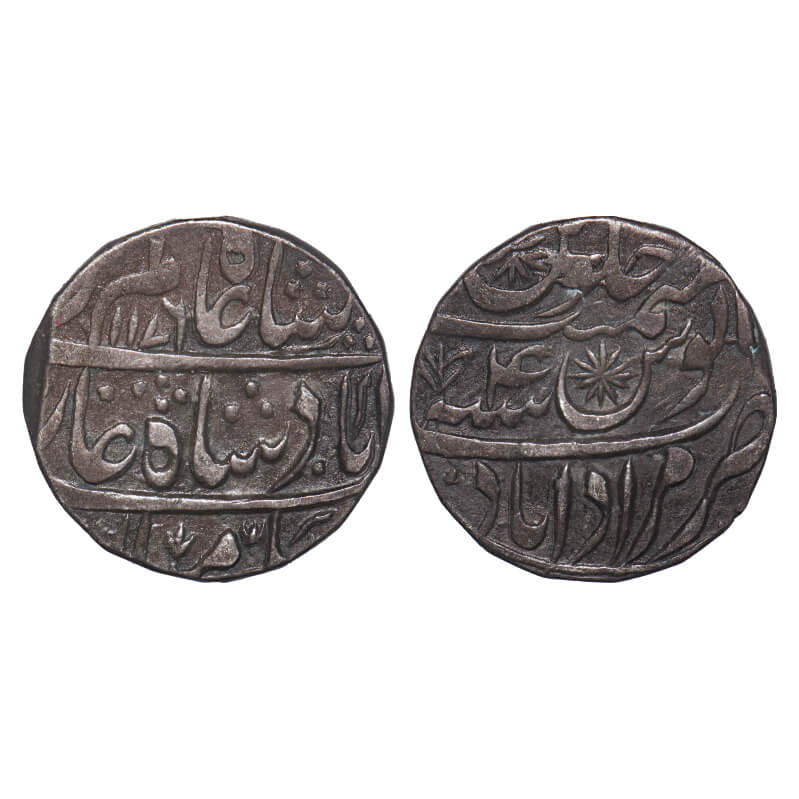 | Rohilkhand, Silver Rupee, 11.13g, Complete Muradabad Mint name, Nawab Dunde Khan Bahadur (AH 1166 - 1187/ 1752 - 1771 AD) INO Shah Alam II, AH 1176/4 RY, Transitional Time issue : now obv Changed from Hami din to Shah Alam Badshah Ghazi type, The reverse arrangement is still older type (as in Hami din ) of Shah Alam II Muradabad , In Earlier coins of AH 1176 / RY4 : julus was in top line & Sanah 4 is far left side in middle line (same as older Hami din type ); Soon after reverse arrangement changed (julus in middle line and Sanah 4 in farleft). This Rupee was struck during a brief period, beautiful Symbols & Sunbrusts, Complete Mint name in bottom line Zarb Muradabad, KM 76.3. Toned Very Fine+, Scarce. |
