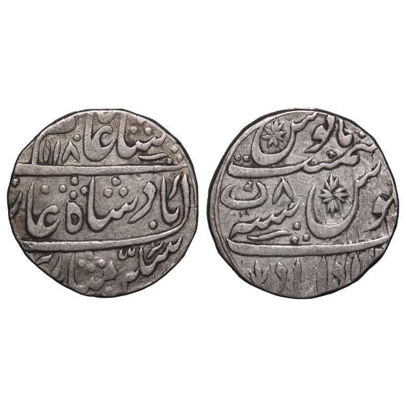 | Rohilkhand, Silver Rupee, 11.18g, Muradabad Mint , Nawab Dunde Khan Bahadur (AH 1166 - 1187/ 1752 - 1771 AD) INO Shah Alam II, AH 1180/8 RY, Flower Symbol & Sunbursts with noon , Mint in bottom Muradabad , KM 76.6 type, Very Fine, Scarce. |