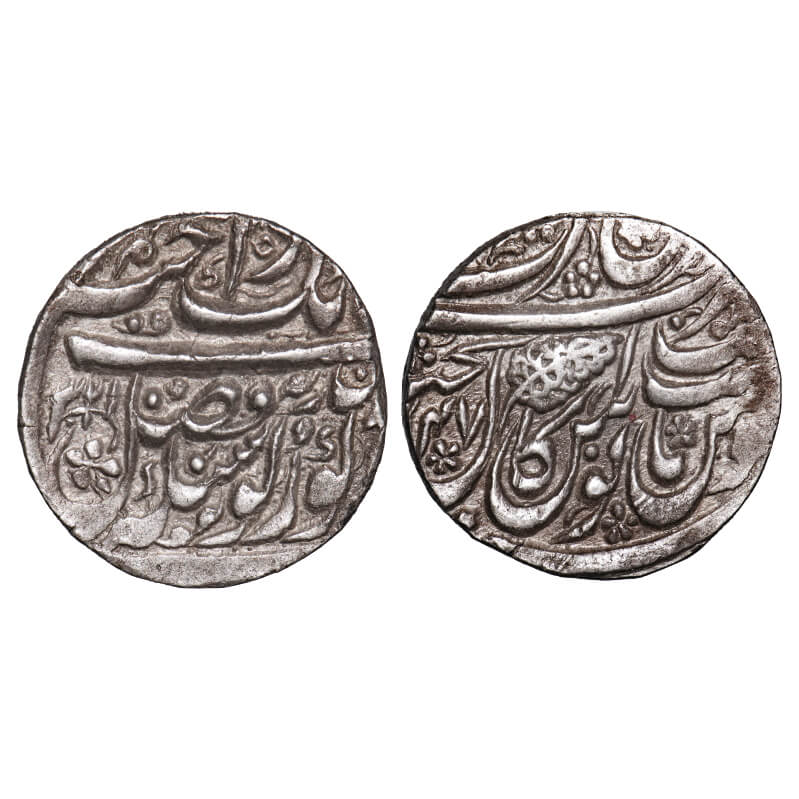 | Sikh Empire, Silver Rupee, 11.11g, Sikhs (Misls), Gulab Singh (VS 1839 -1857, 1782 -1800 AD), Sri Amritsar Mint, "Nanakshahi" couplet, VS (18)47/321 GN, (1790 AD) with Completely Visible Guru Nanak Era 321 on flan, signifying the Birth year of Guru Nanak Ji The Founder of Sikhism, Very advance finer type Leaf style which is different than we generally get in Herrli # 01.06.04 3-year type Variety (VS1845 -1847) rupees, Obv: "sikka zad bar har do alam fazal sachha sahib ast , fateh Gobind shah-e-shahan tegh-i-Nanak wahab ast" with Guru Nanak Era 321, Rev: "zarb Sri Amritsar" with (18)47 Vikram Samvat year, "takht Akal bakht". Note - Moreover, this coin is remarkable not only because the full Guru Nanak Era date is visible but also the characteristic feature of a different type of Leaf which is not comes easily in this type. GS 01.12.01 types/S S Sidhu & D Singh / spink page 191/AM 220ca. Very bold strike, About Extremely Fine, Extremely Rare. |