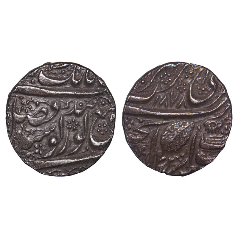| Sikh Empire, Silver Rupee, 11.00g, Ranjit Singh (VS 1856 -1896/1799 -1839 AD), Completely Visible Sri Amritsar Mint, Nanak Shahi Couplet, VS 1878 (1821AD) Flower Like symbol below bind on Obv. Lion Face Like Symbol Above Takht, GS 01.39.01 type unlisted/S S Sidhu & D Singh / spink page 203/AM 2241ja type unlisted. broad Flan , Toned |