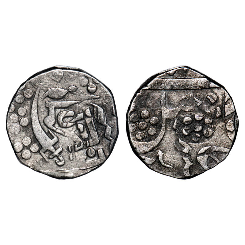 | Baroda, Silver Rupee,11.10g, Khande Rao (AH 1273-1287 / 1856-1870 AD), Baroda Mint, Error Double struck, INO Khel Khas Samsher Bahadur on obverse, nagari letter 'Kha & Ga' on reverse. KM Y 12. About Very Fine, Scarce. |
