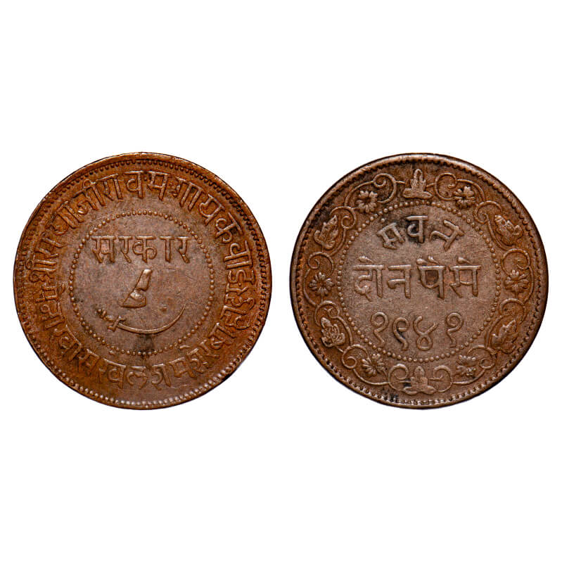 Baroda, Copper 2 Paisa & Paisa (2 Coins), 15.56 & 8.15g, Sayaji Rao III, VS 1949, 'Sa Ga', below sh...