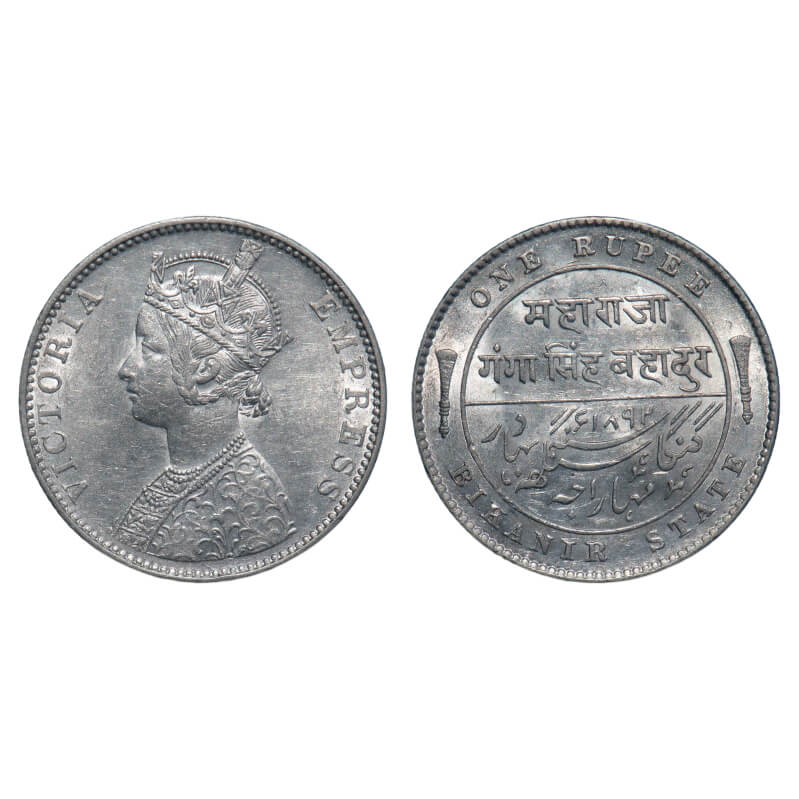 | Bikanir, Silver Rupee, 11.66g, Ganga Singh, 1892 AD, Bombay Mint, Portrait of Victoria Empress, Milled coinage. KM 72. About Uncirculated, Rare. |