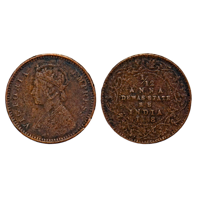 Dewas Senior, Copper 1/12 Anna, Narayan Rao (c. 1864-1892 AD), Crowned bust of Victoria on obv. 188...
