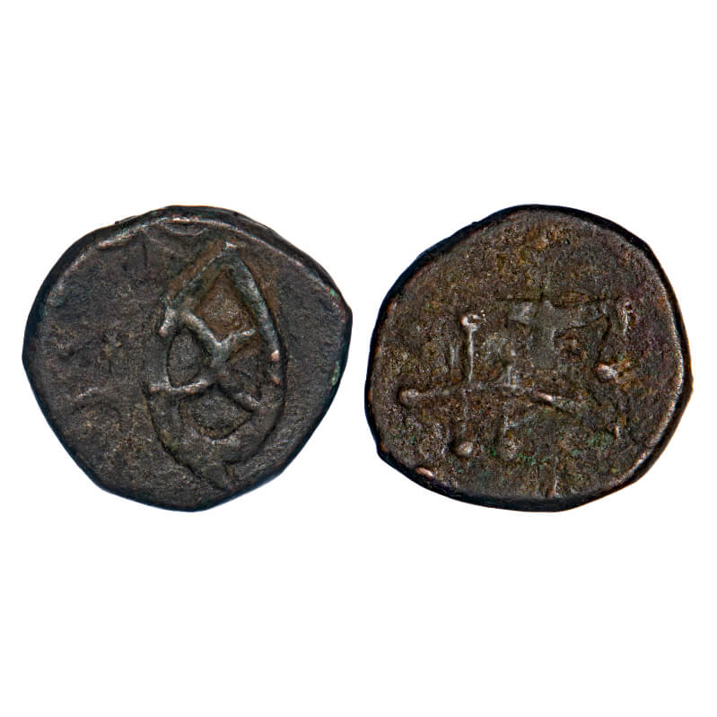 Dhar, Copper Kachha Paisa (2 Coins), 10.53 & 11.59g, over struck type, Obv: Geometricaly designed b...