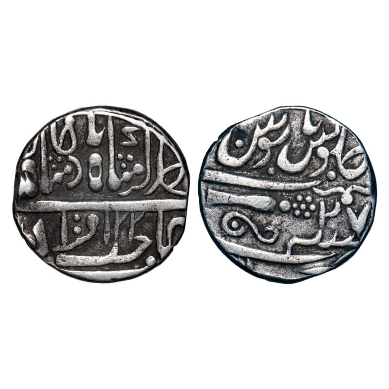 | Gwalior, Silver Rupee, 10.97g, Daulat Rao (1794-1827 AD), Sheopur Mint, INO Muhammad Akbar II, AH 122 (error date)/27 RY, Rev: Cannon to left. KM 202 type. About Very Fine, Scarce. |