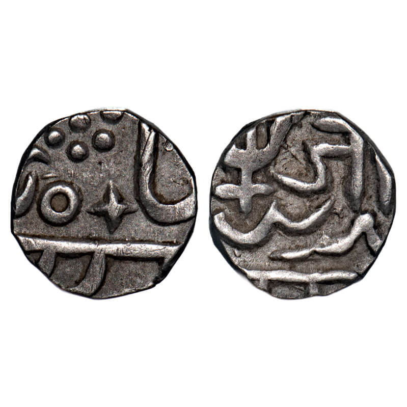 | Gwalior, Silver 1/4 Rupee, 2.72g, Jayaji Rao, Lashkar Mint, INO Shah Alam II, star mark on obverse, nagari 'Ji' and Bow and Arrow points down on rev. KM 157. Very Fine+, Scarce. |