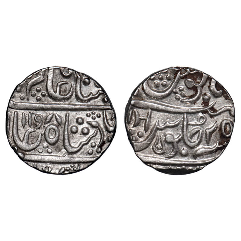 | Indore, Silver Rupee, 11.09g, Ahalyabai (AH 1179-1210 / 1765-1795 AD), AH 1198/25 RY, Malharnagar Mint, INO Shah Alam II, Shivalingam & Devnagari 'AA' looks like farsi. KM unlisted. Extremely Fine+ details, Rare. |