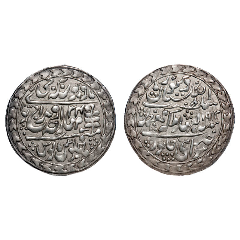 | Jaipur, Silver Nazarana Rupee, 11.32g, Madho Singh II (AH 1298-1341, 1880-1922 AD), in the name of Victoria Queen, Sawai Jaipur Mint, AD 1913/34 RY, Jhar Shahi series. KM 13b. Extremely Fine, Scarce. |
