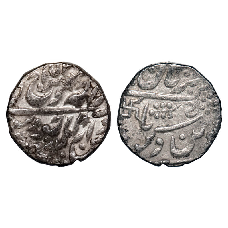 | Jodhpur, Silver Rupee, 11.34g, Dar ul Masur Jodhpur (pseudo Pali) Mint, INO Queen Victoria & Takht Singh (1843-1873 AD), (RY 16 & inverted 45), Sword, Jhar & Swastika on reverse. KM 187/J.Lingen P.07.2.06 Type. Very Fine+, Scarce. |