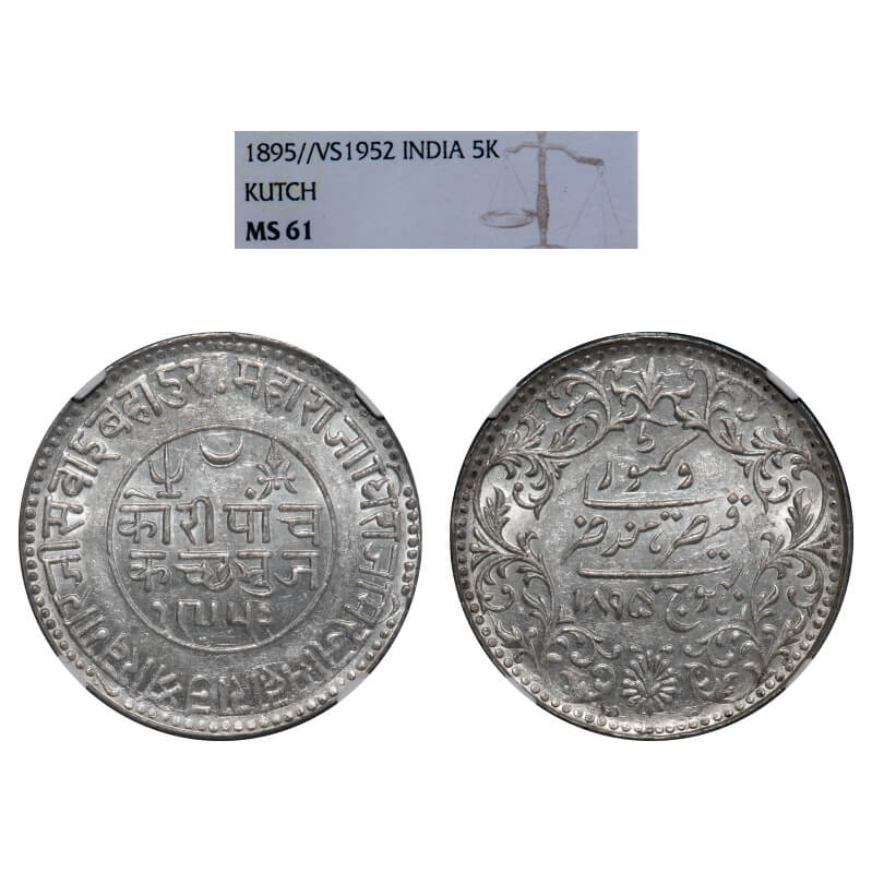 Kutch, Silver 5 Kori, Khengarji III, INO Victoria Empress, VS 1951/1895 AD, large '5'. Edge: KUTCH BHUJ reads clock wise seeing from reverse on top, reeded edge. Rajgor. 208.10A (die variety). NGC graded MS 61, Very Scarce.