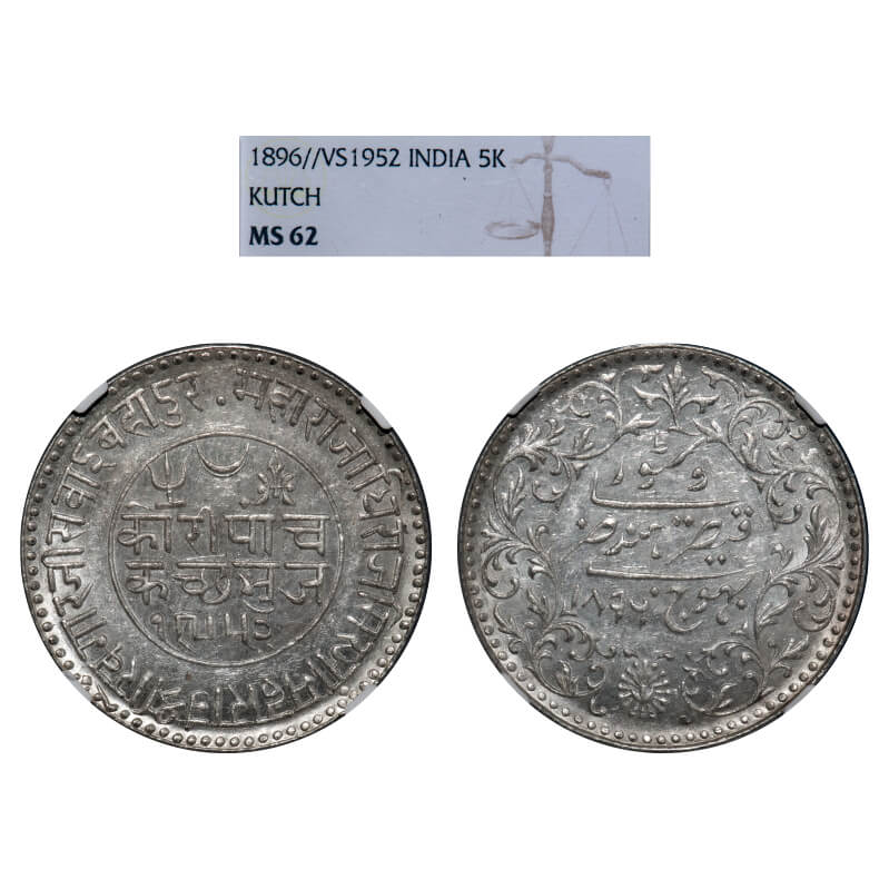 Kutch, Silver 5 Kori, Khengarji III, VS 1952/1896 AD, INO Victoria Empress. Edge: KUTCH BHUJ reads clock wise seeing from obverse on top, reeded edge. Rajgor 208.14. NGC graded MS 62, Very Scarce.