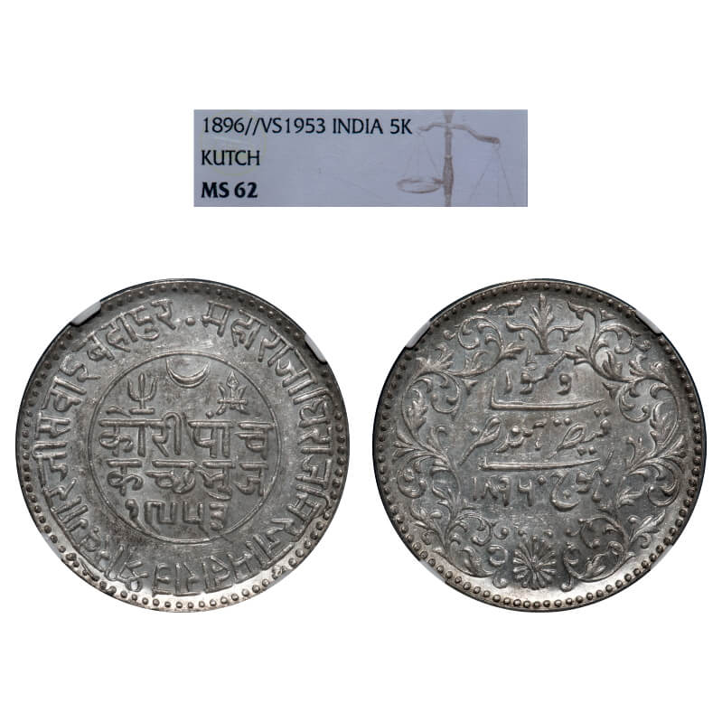Kutch, Silver 5 Kori, Khengarji III, INO Victoria Empress, VS 1953/1896. Edge: KUTCH BHUJ reads clock wise seeing from reverse on top, plain edge. Rajgor 208.15. NGC graded MS 62, Very Scarce.