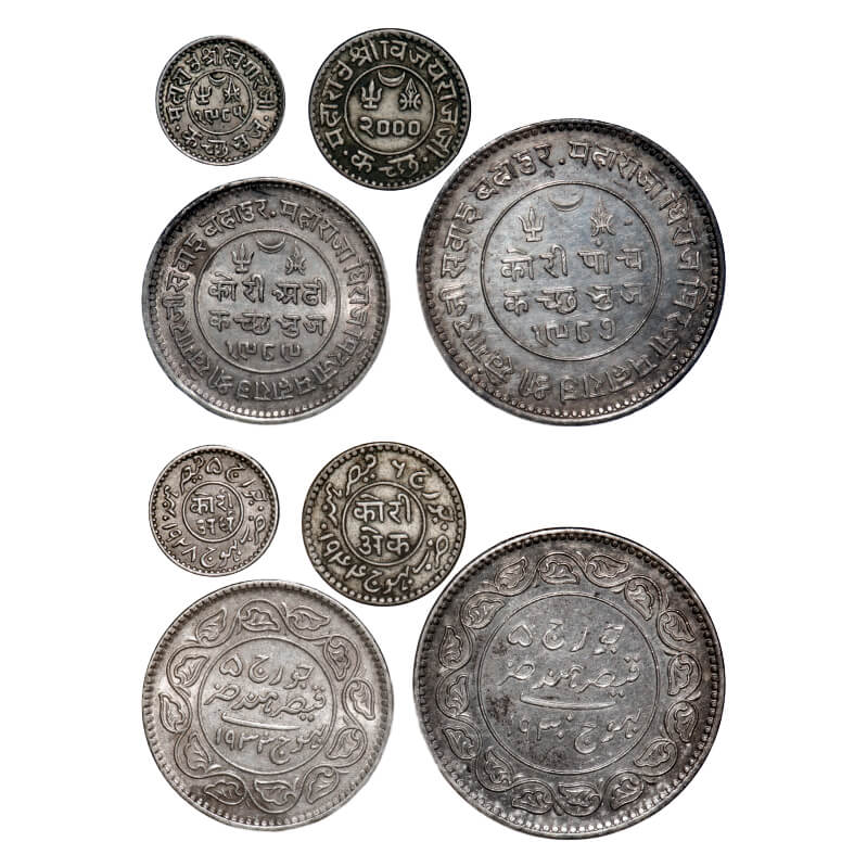 | Kutch, Silver (set of 4 Coins), 1) 5 Kori, 13.92g Khengarji III, VS 1987/1930 AD, INO George V. Edge: KUTCH BHUJ reads clock wise seeing from obverse on top. Rajgor 233.53. 2) 2 ½ Kori, 6.96g, Khengarji III, INO George V, VS 1989/1933 AD. Edge: KUTCH BHUJ reads clock wise seeing from reverse on top. Rajgor 232.34. 3) Kori, 4.69g, Vijayrajji, VS 2000/1944 AD. INO George VI, Rajgor. 269.4. 4) Kutch, Silver ½ Kori, Khengarji III, INO George V, VS 1985/1928 AD. Rajgor 228.1. Very Fine Extremely Fine+, Scarce. |