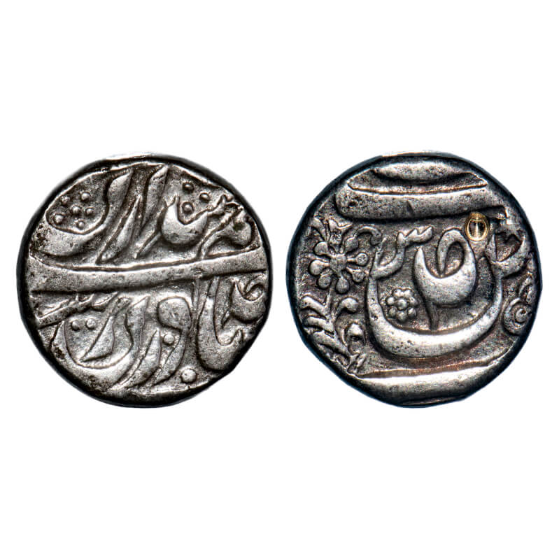 | Maler Kotla, Silver Rupee, 10.44g, Sikandar Ali Khan (AH 1276-1288/1859-1871 AD), (Sahrind Mint), INO Ahmad Shah Durrani, suad on obverse, 'seen' in julus to above left of suaad, and star on reverse. KM Y3.1 type, Extremely Fine, Rare. |