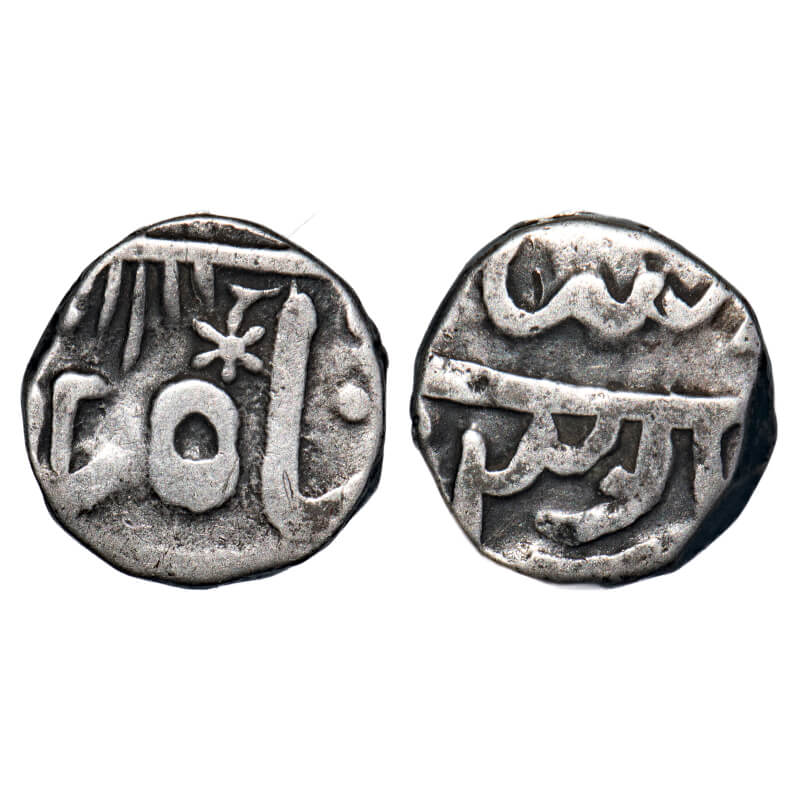 | Mewar, Bhimshahi, Silver 1/2 Rupee, 5.25g, Bhim Singh (VS 1192-1244/ 1777-1818 AD), Udaipur Mint, INO Alamgir II, Star synbols. KM 31. Very Fine, Scarce. |