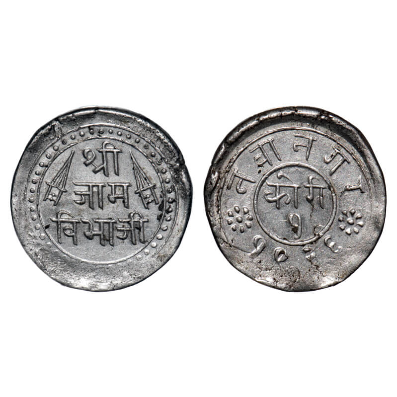 | Nawanagar, Silver, Kori, 4.82g, Jam Vibhaji (VS 1909-1951/1852-1894 AD), VS 1936, Obv: Shri Jam Vibhaji, Rev: 1 kori Nawanagar VS 1936, Milled Coinage. KM 20. edge knocks, Very Fine, Scarce. |