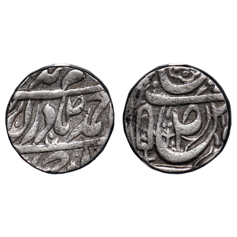 | Patiala, Silver Rupee, 11.00g, Narinder Singh (VS 1902-1919 /1845-1862 AD), (Sahrind) Mint, 'Qadir-e-Bechun' Couplet, VS 1xxx, INO Ahmad Shah Durrani, Obv: Persian legend ""hukm shud az qadir-e-bechun ba Ahmad Badshah, sikka-e-zan bar seem-o-zar az auj mahi ta bamah"", Rev: ""swaad"" symbol in 'seen' of Julus, Complete "Khanda" ( double edge Sword )symbol at the left of 'seen' of 'Julus', Vikram Samvat year 1xxx,"zarb Sahrind" off flan at the bottom, additional "Suaad" symbol on obv. Very Fine+, Scarce. |