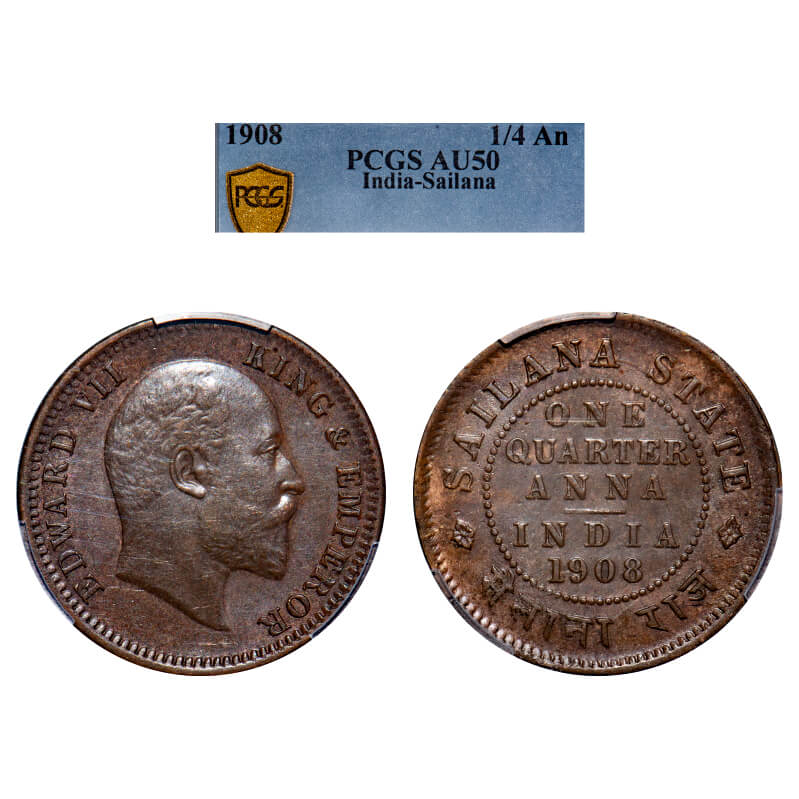 Sailana, Copper 1/4 Anna, Jaswant Singh (1890-1919 AD), 1908 AD, bust of Edward VII on obv. KM 15. PCGS graded AU 50, Very Scarce.