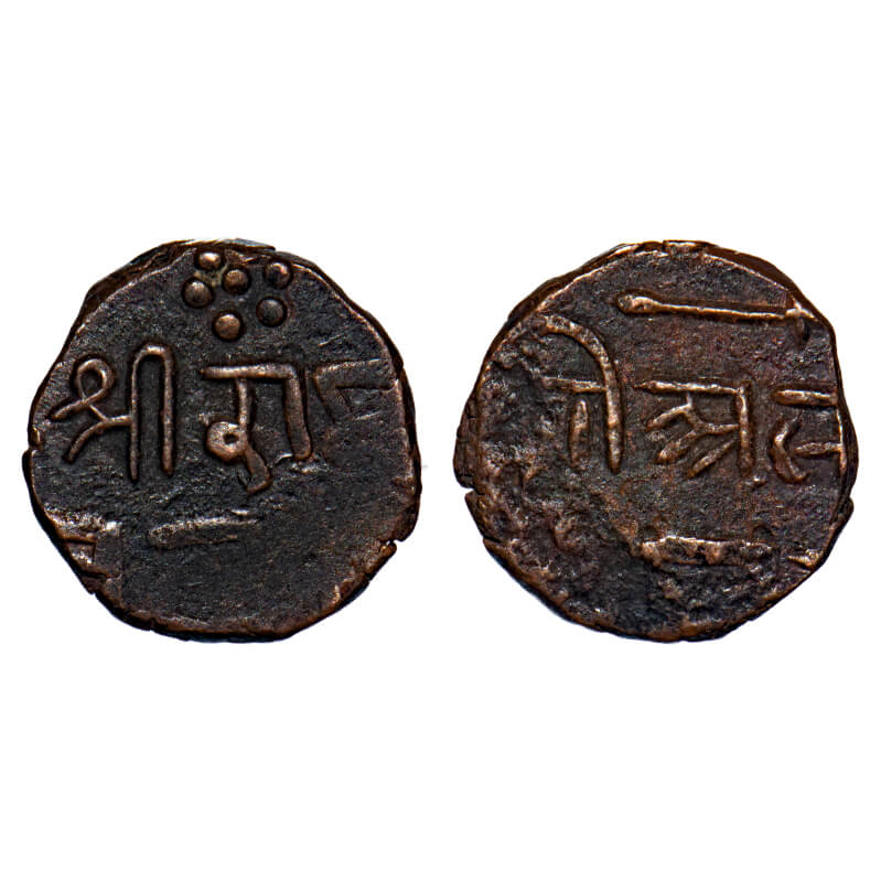 Sunth, Copper Paisa, 6.36g, Parmar Rulers, Rampur Mint, Obv: Unknown nagari scrip on obverse, Sri Ram(pur and pelleted flower above. Sameer Panchal # PM unlisted type. Very Fine, Rare.