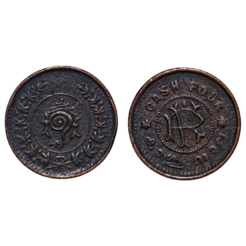 Travancore, Copper Cash Four, 2.41g, Rama Varma VI (ME 1062-1101/1885-1924 AD), struck during 1901-1910 AD, RV monogram within dotted circle, Cash Four. KM 41. Toned About Very Fine, Scarce.