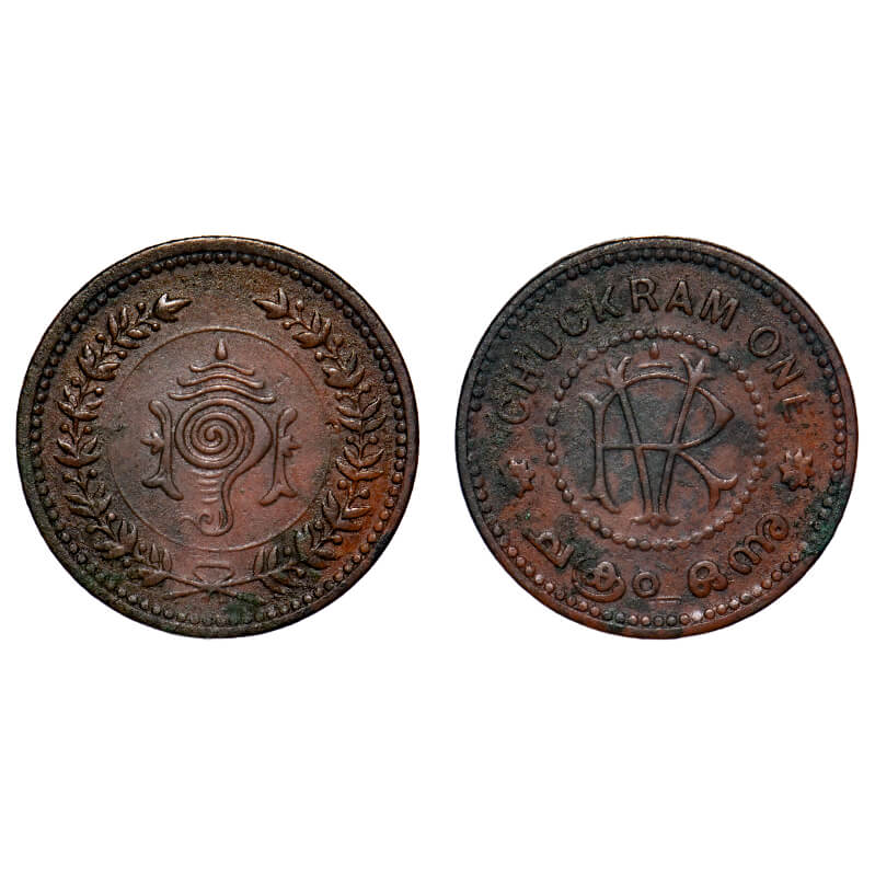 Travancore, Copper, Chuckram One, 10.06g, Rama Varma VI (ME 1062-1101 / 1885-1924 AD), ND type (1901-1910 AD). 51 dots around RV. KM 43/Beena Sarasan 251 type. Toned Very Fine details, Very Scarce.