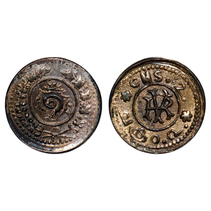 | Travancore, Silver, 2 Chuckram, 0.65g, Rama Varma VI (ME 1062-1101/ 1885-1924 AD), Obv: Conch, Rev: RV monogram and CHS 2. KM 44. rainbow toned, About Extremely Fine, Scarce. |