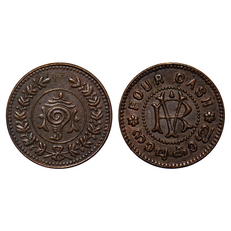 Travancore, Copper Four Cash Four, 2.25g, Rama Verma VI (ME 1062-1101/1885-1924 AD), struck during 1901-1910 AD, RV monogram, Cash Four & cash Eight. 53 dots around. KM 47/Beena Sarasan 248type. About Uncirculated, Scarce.