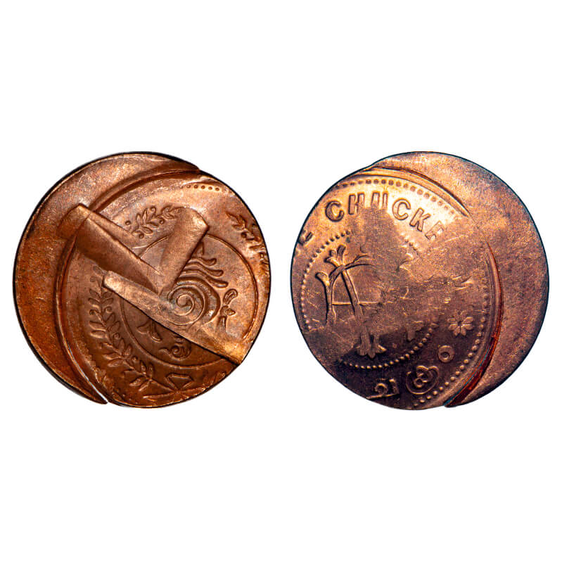 | Travancore, Copper One Chukram, 10.01g, Rama Verma VI, (1885-1924 AD), struck during 1906-1935 AD, Obv: Conch, Error die shift and cancelled marks. KM 49. Uncirculated, Scarce. |