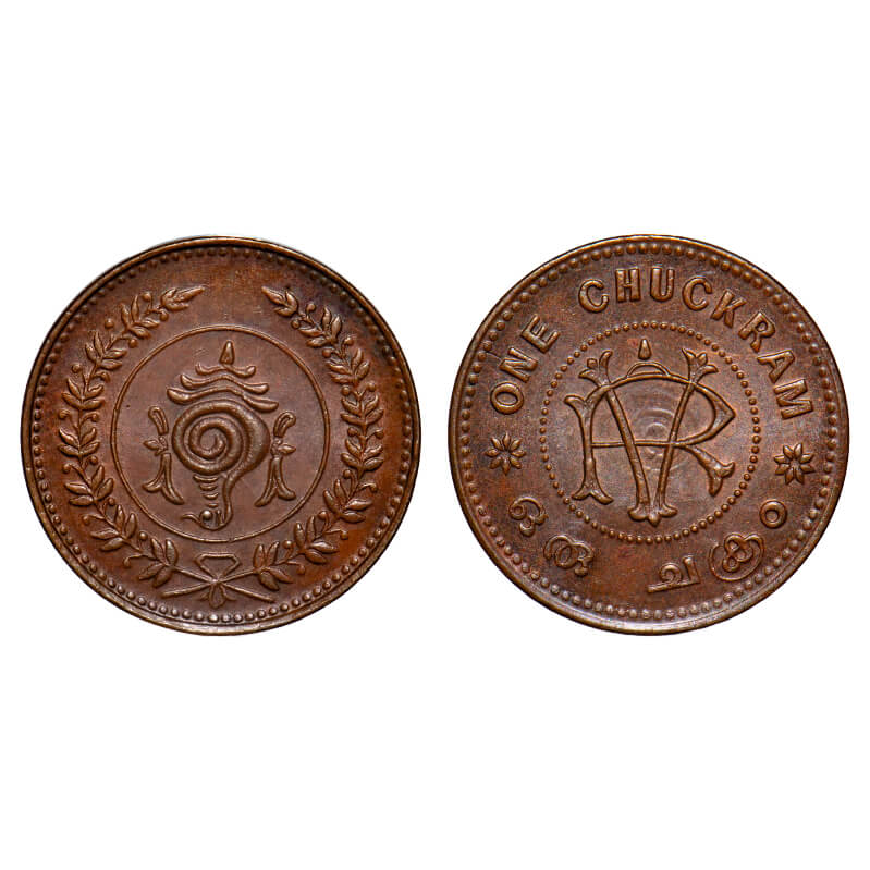 | Travancore, Copper One Chukram, 9.80g, Rama Varma VI, (ME 1062-1101 / 1885-1924 AD), struck during 1906-1935 AD, Obv: Conch. Ghost error, KM 49. Toned Uncirculated, Scarce. |