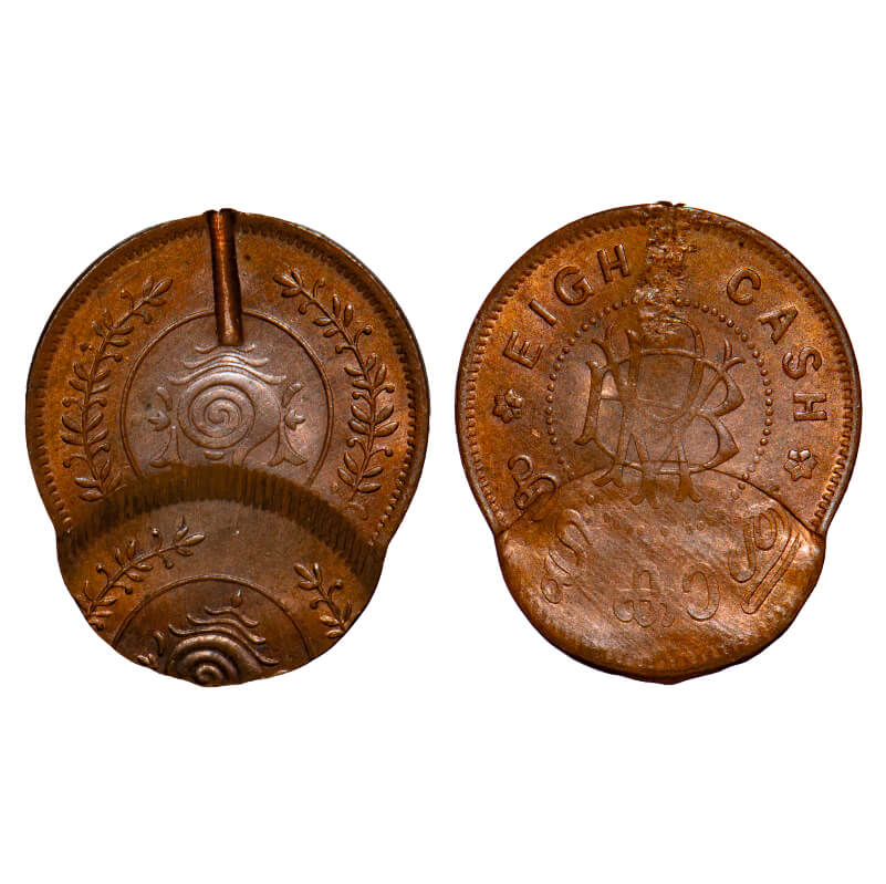 Travancore, Copper 8 Cash (1938-1949 AD), 3.95g, Bala Rama Varma II (ME 1101-1126, 1924-1949 AD), Error double struck and cancelled mark, Obv: Conch, Rev: BRV monogram. Dr. Joseph Thomas M Page No 137 (Defective coins during the minting process). KM 59. About Uncirculated. Scarce.