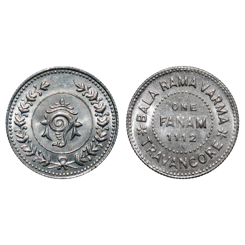 Travancore, Silver, 1 Fanam, 2.78g, Bala Rama Varma II (ME 1101-1126, 1924-1949 AD), ME 1112 (1936-1937 AD). KM 61. Brilliant Uncirculated. Very Scarce.