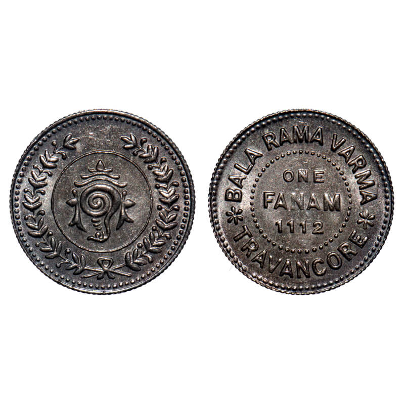 Travancore, Silver, 1 Fanam, 1.50g, Bala Rama Varma II (ME 1101-1126, 1924-1949 AD), ME 1112 (1936-1937 AD). KM 61. Brilliant Uncirculated. Very Scarce.