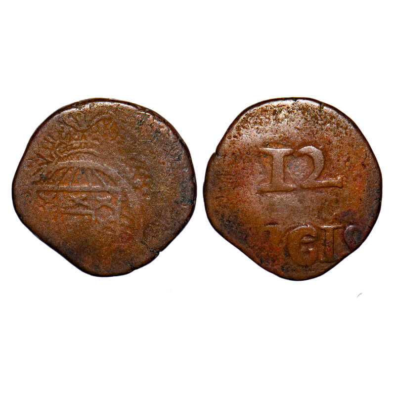 | Indo Portuguese, Copper 12 Reis, 7.11g, D. Joao VI (1816-1826 AD), Goa Mint, Obv: Crown, Rev: Denomination. A.Gomes (page 589) 08.01,/ KM 231. About Very Fine, Scarce. |