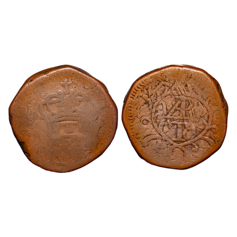 | Indo Portuguese, Copper Tanga (60 Reis), 40.61g, D.Miguel (1828-1834 AD), ND, Goa issue, Obv: Crest, Rev: PR (Portaria Registada) over struck on D Jose coin. A.Gomes (page 594), 07.05 overstruck type, KM 251 unlisted. About Very Fine, Scarce. |